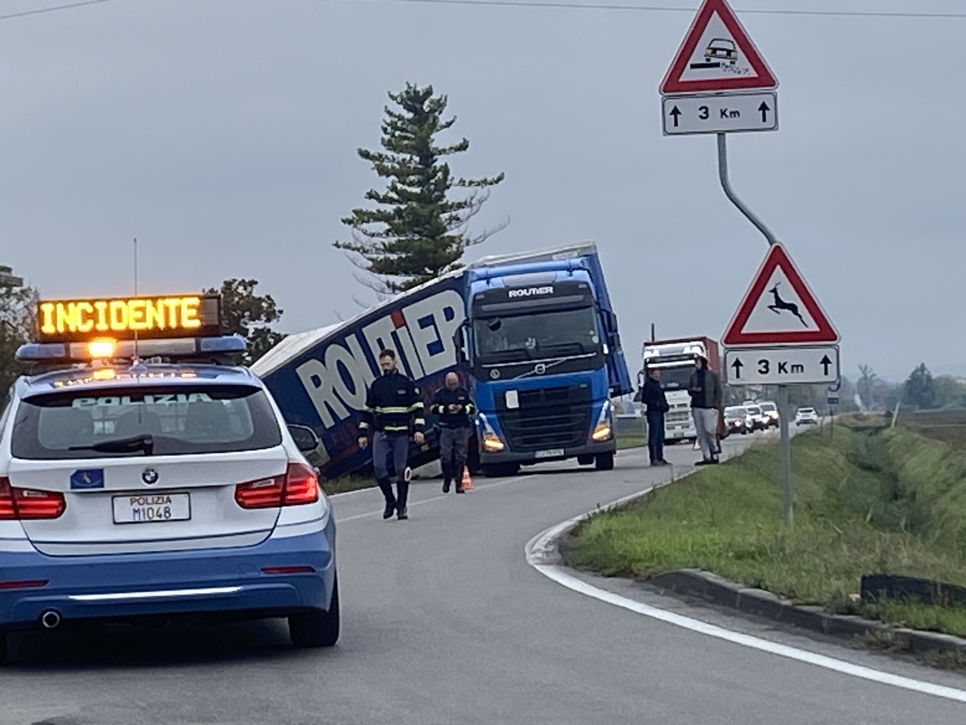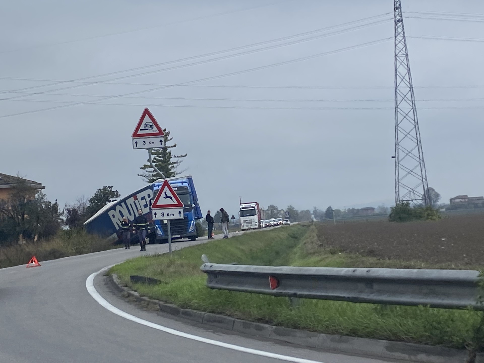 Strada bloccata tra la rotatoria della via Emilia e Madregolo per un grosso camion che è parzialmente finito nel fosso con il rimorchio in questo momento sul posto la polizia stradale e i mezzi di soccorso dell’A.C.I. per recuperare il mezzo.