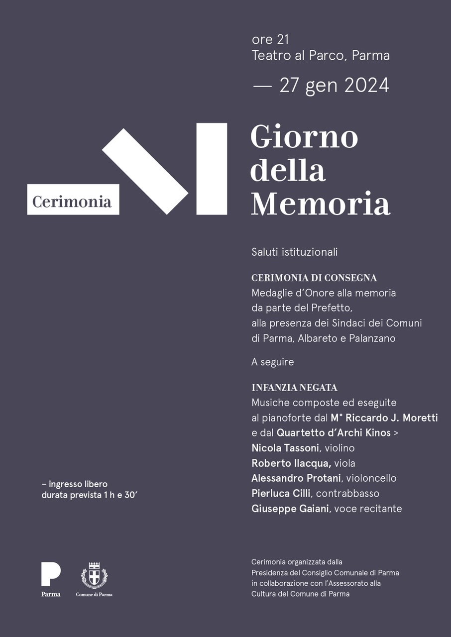 Sabato 27 gennaio, alle 21,00, presso il Teatro al Parco Giorno della Memoria 2024 la Presidenza del Consiglio Comunale in collaborazione con l’Assessorato alla Cultura promuove la cerimonia di consegna delle Medaglie d’Onore alla Memoria da parte del Sindaco di Parma Michele Guerra, del Prefetto Antonio Garufi, del Vice Sindaco e Assessore alla Cultura Lorenzo Lavagetto e del Presidente del Consiglio Comunale Michele Alinovi, alla presenza dei Sindaci di Albareto e Palanzano.