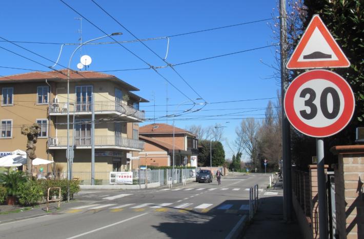 Qui è prevista la creazione di una «zona 30», però fino a quando questa zona non sarà tale è strana l’assenza dei cartelli «30» prima dei dossi. Una volta creata (e «segnalata») la «zona 30», i cartelli di limitazione della velocità avvicinandosi ai dossi non sono necessari.