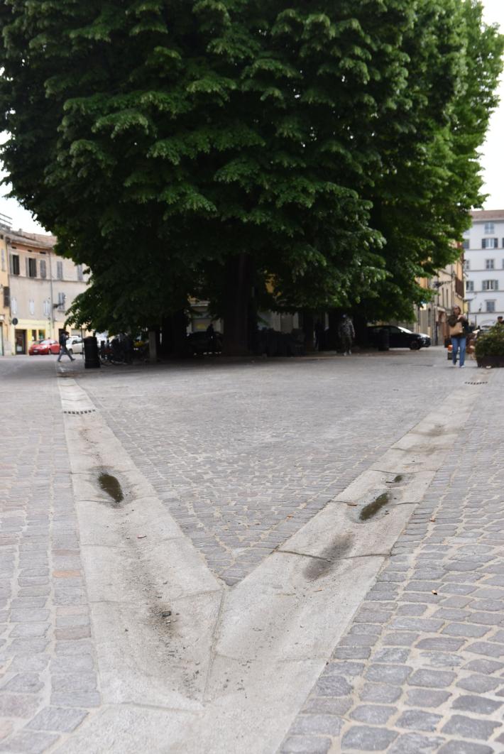 Le canaline precedenti, realizzate in lastre di pietra di Apricena, hanno mostrato limiti di resistenza ai cicli di gelo e disgelo tipici del clima invernale parmigiano. Questo ha comportato un degrado che ha reso necessaria la sostituzione per evitare rischi per la circolazione.
