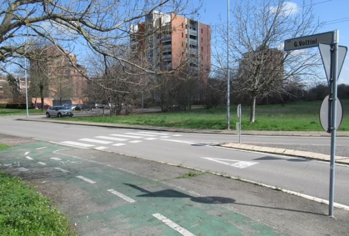 Non c’è lo scivolo, che invece c’è in tutte le «zebre» della città, ma un gradino da una parte dell’attraversamento pedonale all’inizio di via Voltini, all’incrocio con via Sidoli. È un attraversamento destinato anche alle biciclette, come è evidente dalla tracciatura orizzontale, però dove c’è il gradino la pista ciclabile non prosegue.
