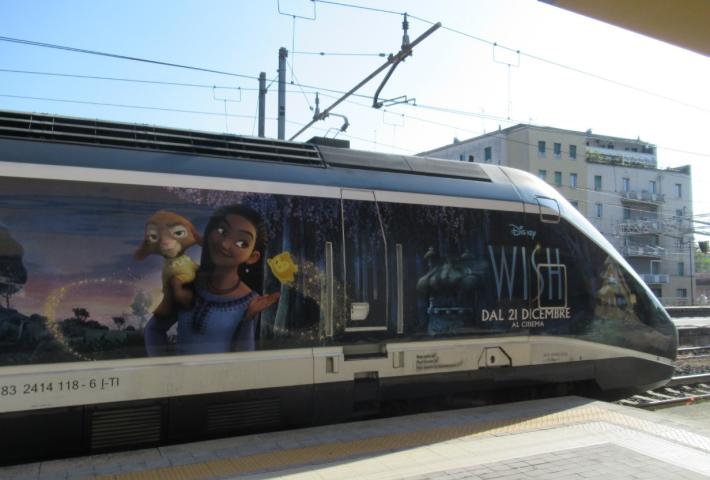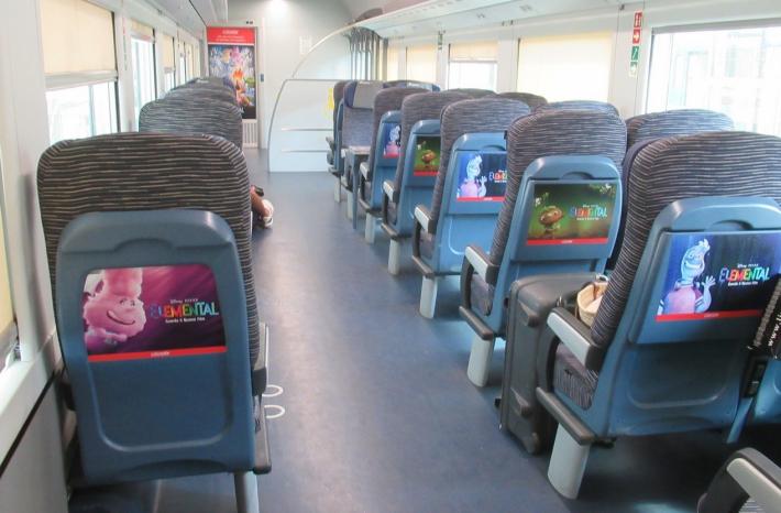 Questi locomotori «decorati» sono in testa o in coda ad alcuni treni a lunga percorrenza. Ecco qualche titolo pubblicizzato: «Strange world – Un mondo misterioso», «Inside out 2» e «Wish». La pubblicità cinematografica continua poi nella carrozza 3 di seconda classe: è l’«area family», con giochi allestiti sui tavolini e con più spazio per i viaggiatori rispetto agli altri vagoni di seconda classe.
