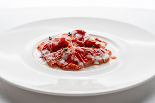 Dopo aver già definito l’area aperitivo, la Cena dei Mille 2024 si aprirà con “Rosso Carpaccio”, ovvero l’antipasto firmato da Alma - Scuola Internazionale di Cucina Italiana. Il pomodoro nella sua lavorazione è stato leggermente disidratato così da concentrarne il sapore e amplificarne la consistenza. Il carpaccio sarà poi accompagnato da cetriolo barattiere crudo, cipolle borettane e ultimato con una maionese di mandorle.