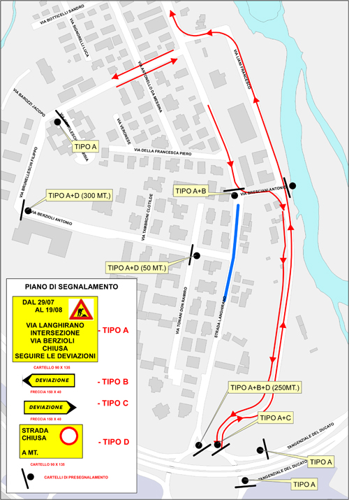 Istituzione del divieto di fermata ambo i lati. I veicoli che percorrono strada Langhirano direzione sud (tangenziale) saranno deviati da apposito piano di segnalamento sul seguente percorso: via Bresciani, Via Liani, Rotatoria Langhirano/Campus. I veicoli che percorrono strada Langhirano direzione nord saranno deviati da apposito piano di segnalamento sul seguente percorso: Rotatoria Langhirano/Campus, via Liani, strada Langhirano. I veicoli che normalmente accedono in via Berzioli da via Langhirano o si immettono in strada Langhirano da via Berzioli verranno deviati in via Brunelleschi.