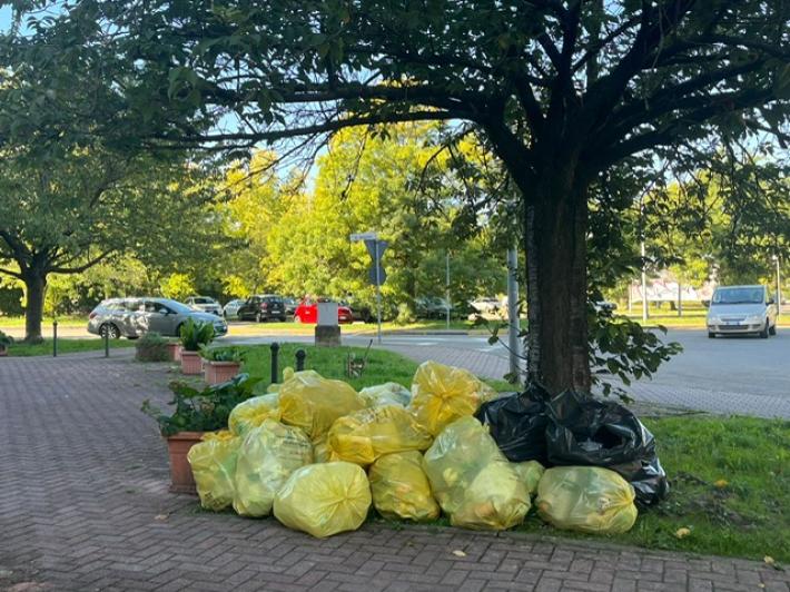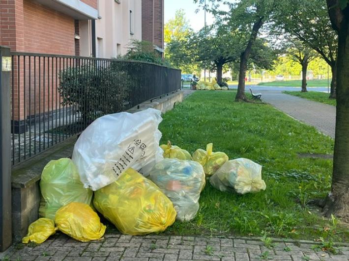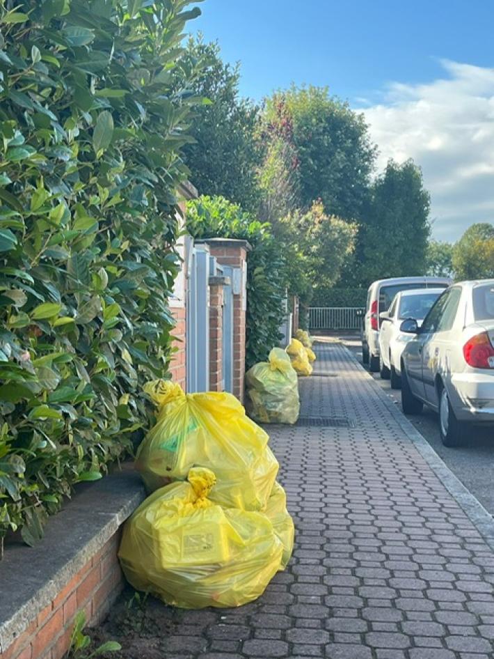 Una residente di via Picasso sottolinea che i sacchi della plastica si sono accumulati nell'area verde, come si può vedere nelle foto, poiché lunedì scorso la raccolta è "saltata". E' atteso per oggi il ritiro da parte degli operatori.
