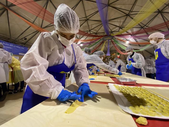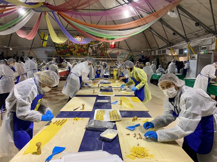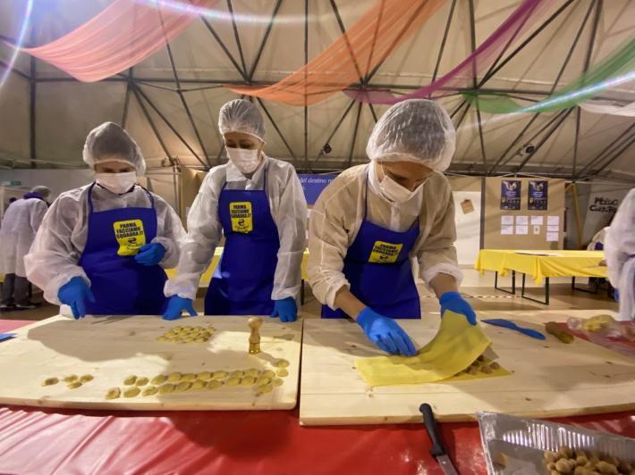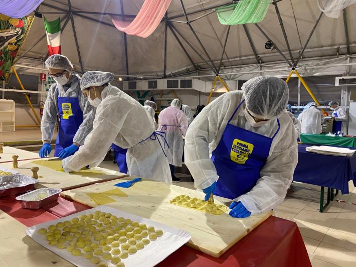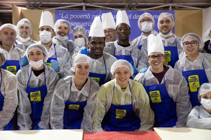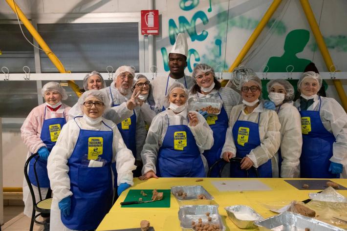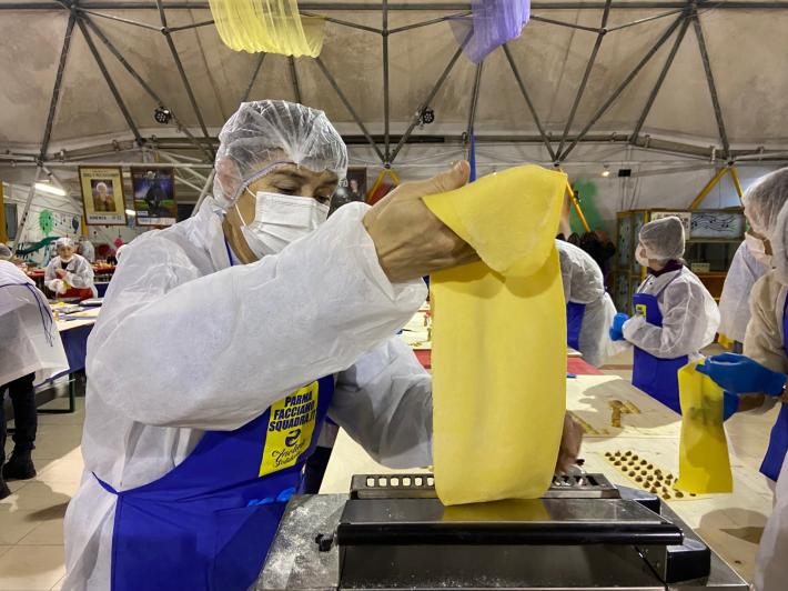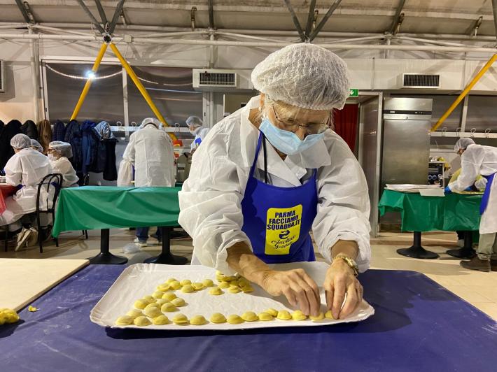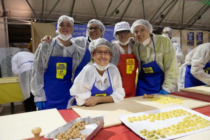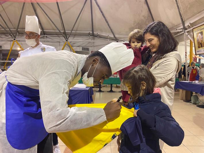 Parata di campioni? Per un pomeriggio è meglio definirla parata di chef al al centro sociale anziani Il Tulipano. Già perchè a preparare gli anolini solidali, oggi, con tanto di cappello bianco da chef sono stati non solo l'immensa Giulia Ghiretti, ma anche una coppia di giocatori crociati del Parma calcio, Bonny e Coulibaly. Con loro alcuni funzionari dell'Efsa. Sorrisi, sport, cucina, parmigianità e... tanta solidarietà.