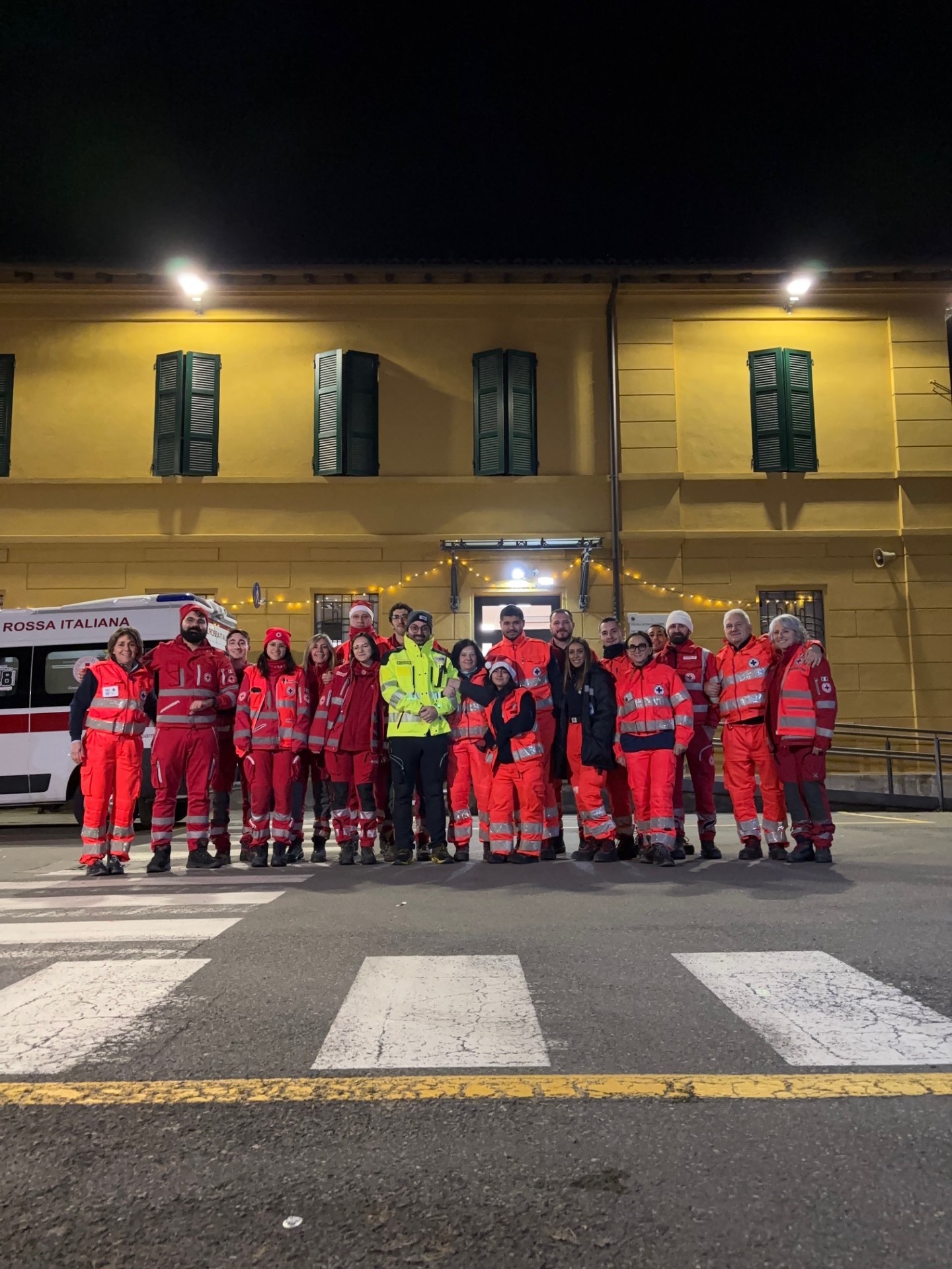 I ragazzi della Croce rossa Parma e della Assistenza pubblica Parma riuniti a mezzanotte in via a Gorizia per il saluto di rito e scambio di auguri in occasione del Natale.