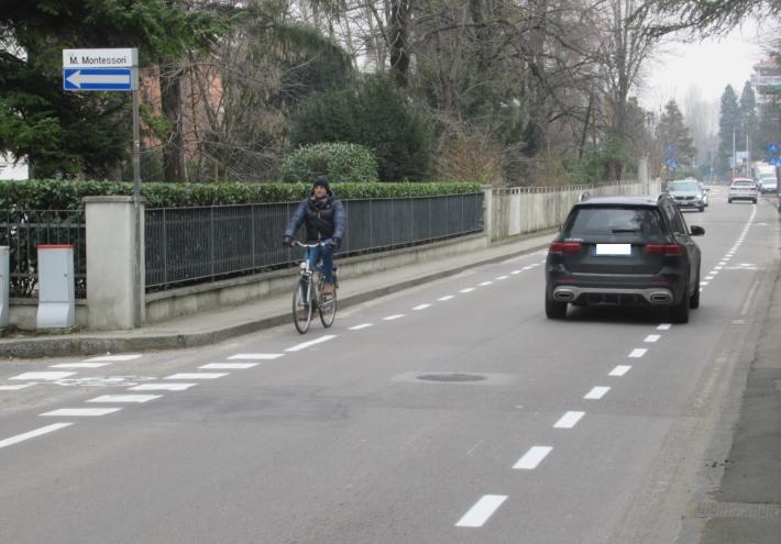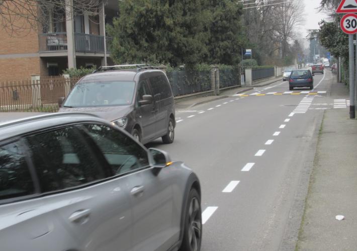 Nei giorni scorsi in questo tratto di strada con la nuova limitazione della velocità massima di 30 chilometri all’ora è stata tracciata su entrambi i lati la corsia per biciclette, non separata fisicamente dall’area di transito degli altri veicoli ma individuata da una linea tratteggiata.