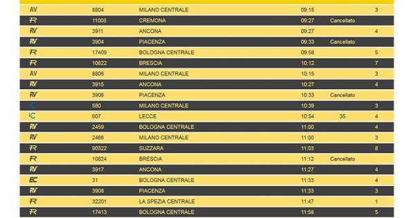 È cominciato alle 9 uno sciopero nazionale del personale del gruppo FS Italiane, Italo e Trenord, che si protrarrà fino alle 17 e può comportare la cancellazione totale o parziale dei treni. Al momento nel tabellone delle partenze dalla stazione di Parma, visibile online in tempo reale nel sito di Rfi, risultano già alcune cancellazioni: il treno regionale per Cremona delle 9.27, i treni regionali veloci per Piacenza delle 9.33 e delle 10.33, il regionale per Brescia delle 11.12 e il Frecciarossa per Lecce delle 12.43. Non è da escludere la cancellazione di altri convogli.