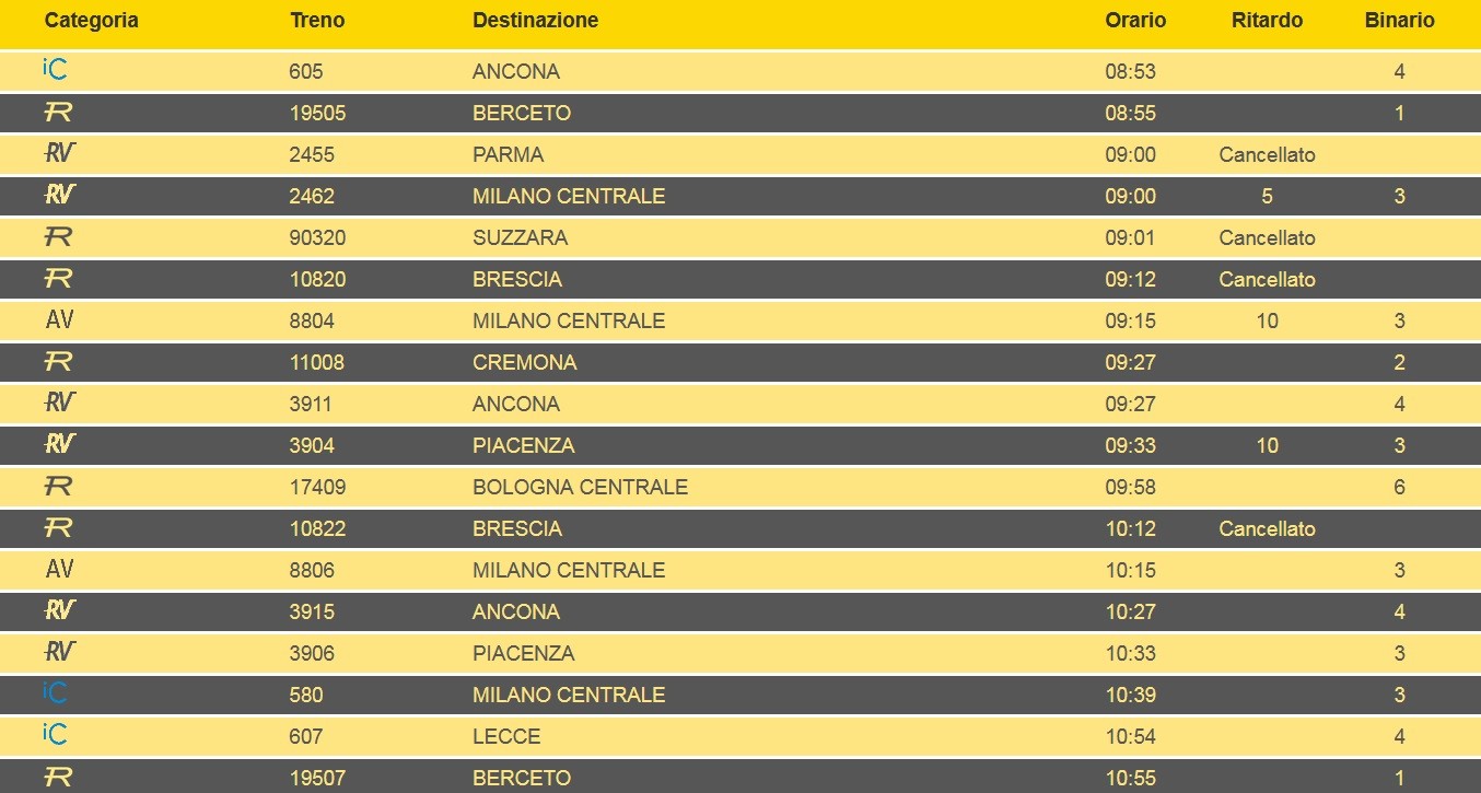 Oggi sono possibili disagi per chi viaggia in treno: dalle 9.01 alle 17 i treni possono subire cancellazioni o variazioni per uno sciopero nazionale del personale del Gruppo FS, Trenitalia, Trenitalia Tper e Trenord. Nel tabellone delle partenze dalla stazione di Parma, visibile online in tempo reale nel sito di Rfi, risultano già alcune cancellazioni. La situazione è in evoluzione e non è da escludere la cancellazione di altri convogli nel corso della giornata, con ripercussioni anche oltre le 17, orario di conclusione dello sciopero. Informazioni sui collegamenti e servizi attivi sono disponibili consultando l’app di Trenitalia, la sezione Infomobilità di trenitalia.com, il sito www.trenord.it o tramite l’app di Trenord, sito trenitaliatper.it, il numero verde gratuito 800892021, oltre che nelle biglietterie e presso il personale di assistenza clienti.