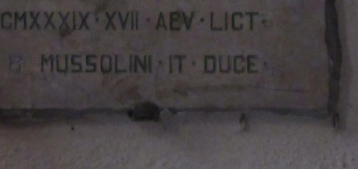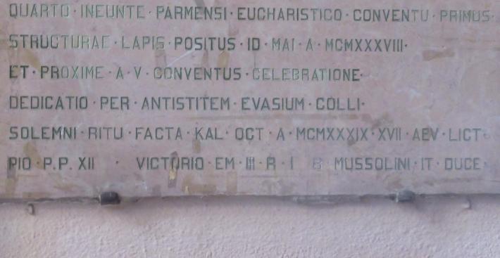 In fondo alla lapide, nell’ultima riga, sono incisi i nomi delle massime autorità di quel periodo: Papa Pio XII, Re Vittorio Emanuele III e, appunto, Benito Mussolini in qualità di Presidente del Consiglio dei Ministri del Regno d’Italia, cioè capo del governo. La lapide rappresenta anche un ringraziamento ai parmigiani, dal momento che per la costruzione della chiesa del Corpus Domini si rese indispensabile una sottoscrizione popolare.