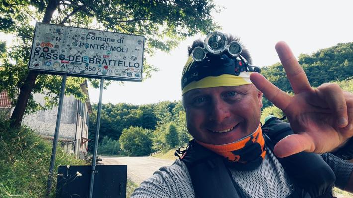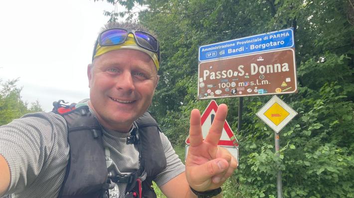 Walter Perotti è partito da Salsomaggiore domenica a mezzanotte in direzione Pellegrino poi Bore, passo Pellizzone, Bardi inserendosi nella via degli Abati direzione Borgotaro superando il secondo il passo Santa Donna. Una pioggia rinfrescante lo ha portato poi verso il Brattello superato prima che facesse di nuovo notte. Una lunga discesa verso Pontremoli, il cambio indumenti per la notte e via verso il mare.