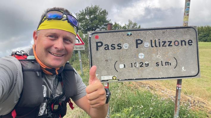 Le code in autostrada, i problemi per i cantieri dell’Autocisa, gli hotel pieni o gli eventuali ritardi dei treni a lui non interessano. Perché va a piedi e di corsa. Anche per 183 chilometri e senza mai fermarsi di notte. Ed arriva in orario.