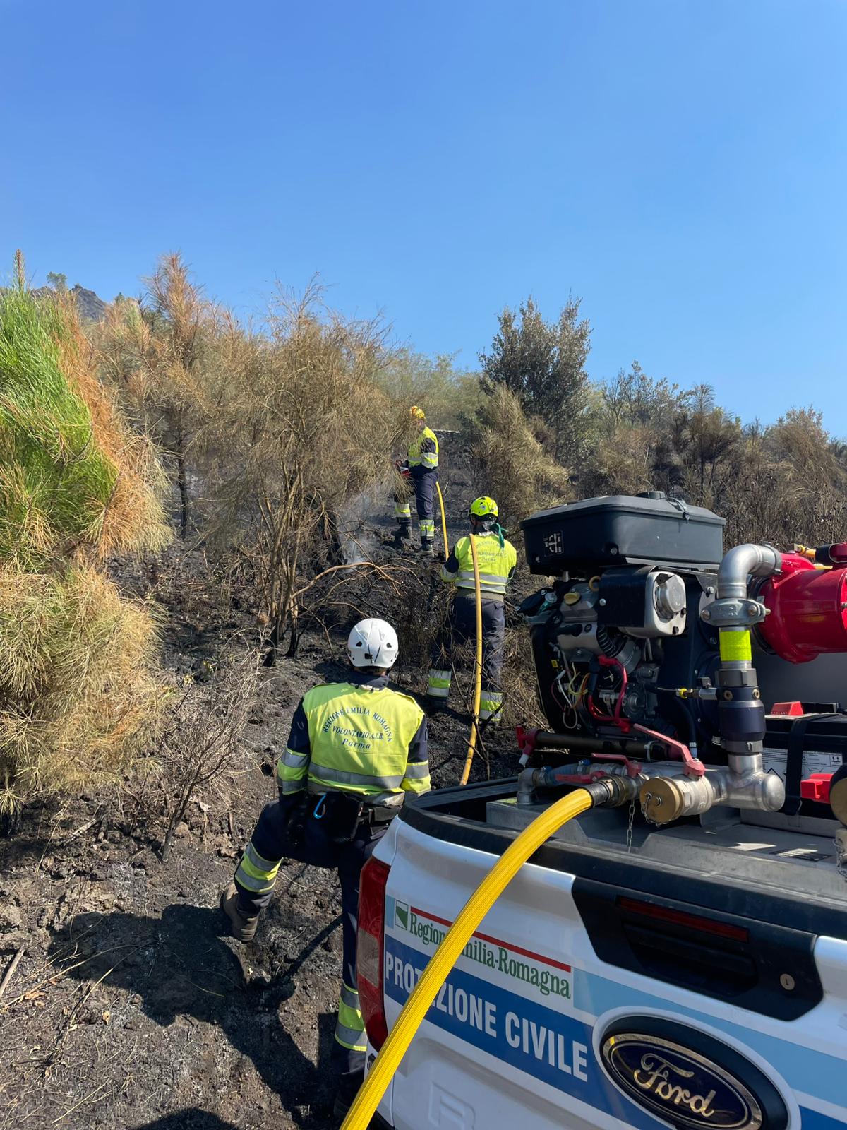 Bruciavano i boschi, bruciava l'aria, con i suoi 40 gradi all'ombra, e continuava a bruciare la terra incenerita, tanto da staccare le suole delle scarpe, e così il sottosuolo, con le radici delle piante ridotte a tizzoni ardenti, micce per roghi a distanza, trappole per chi camminava sulle sabbie mobili di cenere. Dodici ore, al netto dei viaggi, è durata la missione sul Vesuvio dei volontari della Protezione civile parmigiana: dodici ore con un peso specifico difficile da immaginare per chi gli incendi li vede in tv o anche solo da lontano. Duccio Maestri, Alessandro Bianchi, Giuseppe Cavatorta, Andrea Solari e Marco Azzerini hanno combattuto in condizioni proibitive a Boscotrecase, contro focolai pronti a ridar vita ai roghi, inerpicati sul monte che di fuoco ha l'anima. In condizioni come queste, oltre all'acqua - non sempre disponibile - è soprattutto sui mezzi manuali che si può contare. Il badile per primo. «Avessimo dovuto reggere altri due giorni come previsto, non so come avremmo fatto» commenta Maestri, decano del Nip.