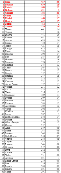 L'Istat ha reso noti oggi i dati territoriali dell'inflazione di ottobre, in base ai quali l'Unione Nazionale Consumatori ha stilato la classifica delle città più care d'Italia, in termini di aumento del costo della vita. Non solo, quindi, delle città capoluoghi di regione o dei comuni con più di 150 mila abitanti. Parma è al 47° posto (+ 248 euro, e +0,9%). In testa alla graduatoria, Siena dove l'inflazione tendenziale pari a +2,8%, la più alta d'Italia, si traduce nella maggior spesa aggiuntiva su base annua, equivalente a 757 euro per una famiglia media. Medaglia d'argento per Bolzano che, con +1,9% su ottobre 2024, ha un incremento di spesa annuo pari a 630 euro a famiglia. Sul gradino più basso del podio Pistoia, terza sia per inflazione, pari al 2,1%, che per spesa supplementare, pari a 568 euro annui per una famiglia tipo. Sull'altro fronte della classifica, la città più virtuosa d'Italia è Campobasso, dove con +0,1%, l'inflazione più bassa del Paese, si ha un aumento su base annua di 24 euro. Al secondo posto sia per inflazione che per spesa, Trapani, +0,2% e +46 euro. Medaglia di bronzo per Vercelli (+0,3% e +71 euro).