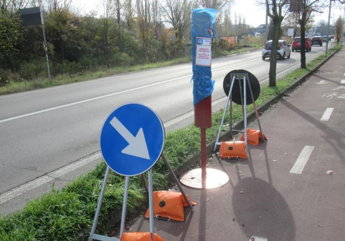 Dopo pochi giorni di deviazioni e tante proteste, da ieri sabato i bus della linea 15 passano nuovamente in via Milano. Da osservare le caratteristiche di questa fermata di viale Europa: una palina mobile sulla pista ciclopedonale e, per chi saliva o scendeva dal bus, qualche decina di centimetri di prato da oltrepassare. Insomma, non proprio la fermata «ideale». Oltre al fatto di dover attraversare una strada dove il traffico è spesso intenso.