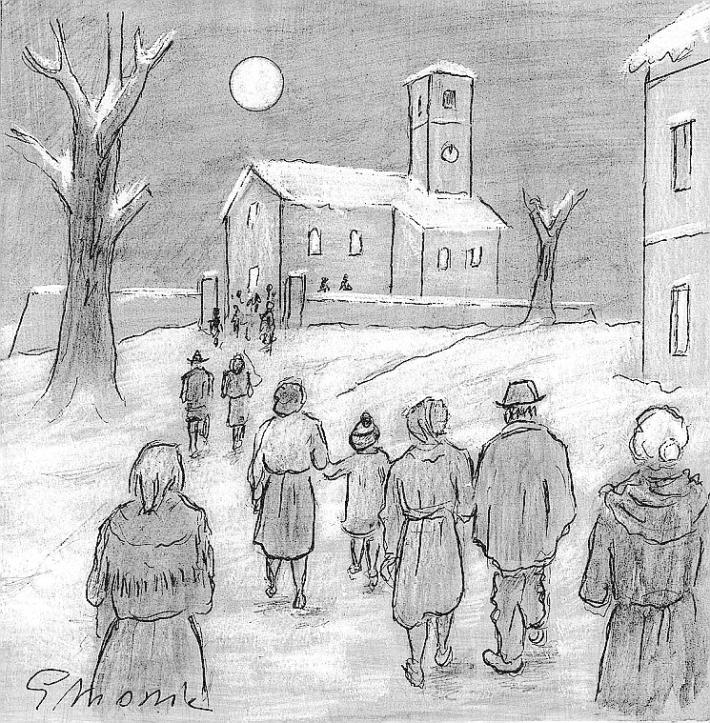 V VEGLIE: logicamente la più sentita era quella della Vigilia. Dopo la cena di magro (in città, maltagliati o tagliatelle conditi con burro e formaggio e l’ultima forchettata spruzzata con una lacrima di vino, «pasta in vén», seguiti da «marluss fritt e in bjanch», nella bassa tortelli di zucca, in montagna pasta con sugo di funghi o tortelli di patate e porri) i «cazànt» si riunivano in casa dell’uno o dell’altro per la tombola. In campagna non si andava nella stalla per il fatto che la cucina, una volta tanto, era riscaldata bene e le bestie dovevano essere lasciate sole a «parlare tra loro». La tavola rimaneva apparecchiata perché si credeva che i cari defunti, alla notte, riprendessero il loro posto come anche nella notte dei Morti. Veniva conservato anche il pane perché, sfiorato dagli Angeli nella Notte Santa, sarebbe servito durante l’anno agli ammalati. Il «rezdór», dal canto suo, girava tutti gli angoli più reconditi della casa con un rametto di ginepro con l’intento di scacciare gli spiriti maligni.