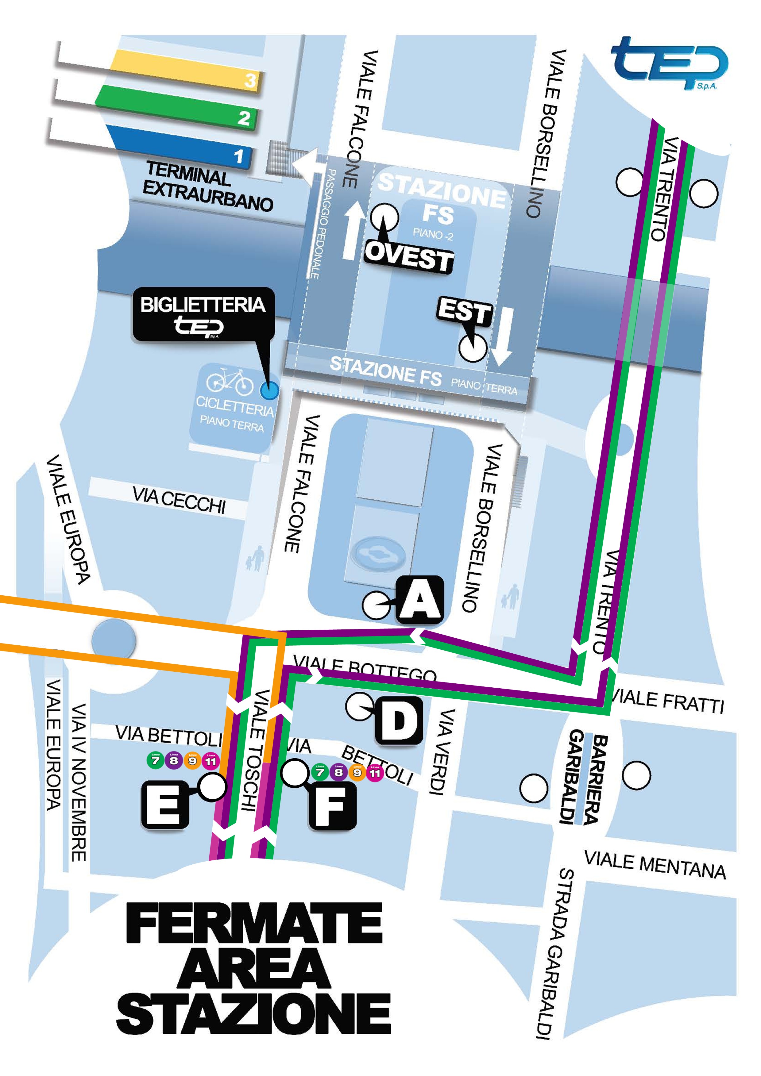 Dalla stazione, in direzione centro città, i bus avranno capolinea di partenza in viale Toschi – fermata E.