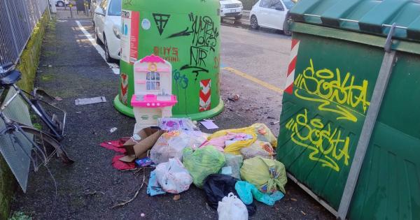 Due foto con la stessa cornice di rifiuti. In via monte Baerdone, angolo via Duca Alessandro, tra i sacchetti sbuca anche la casetta delle bamble. L'altro foto è stata scattata in piazzale Lago Santo