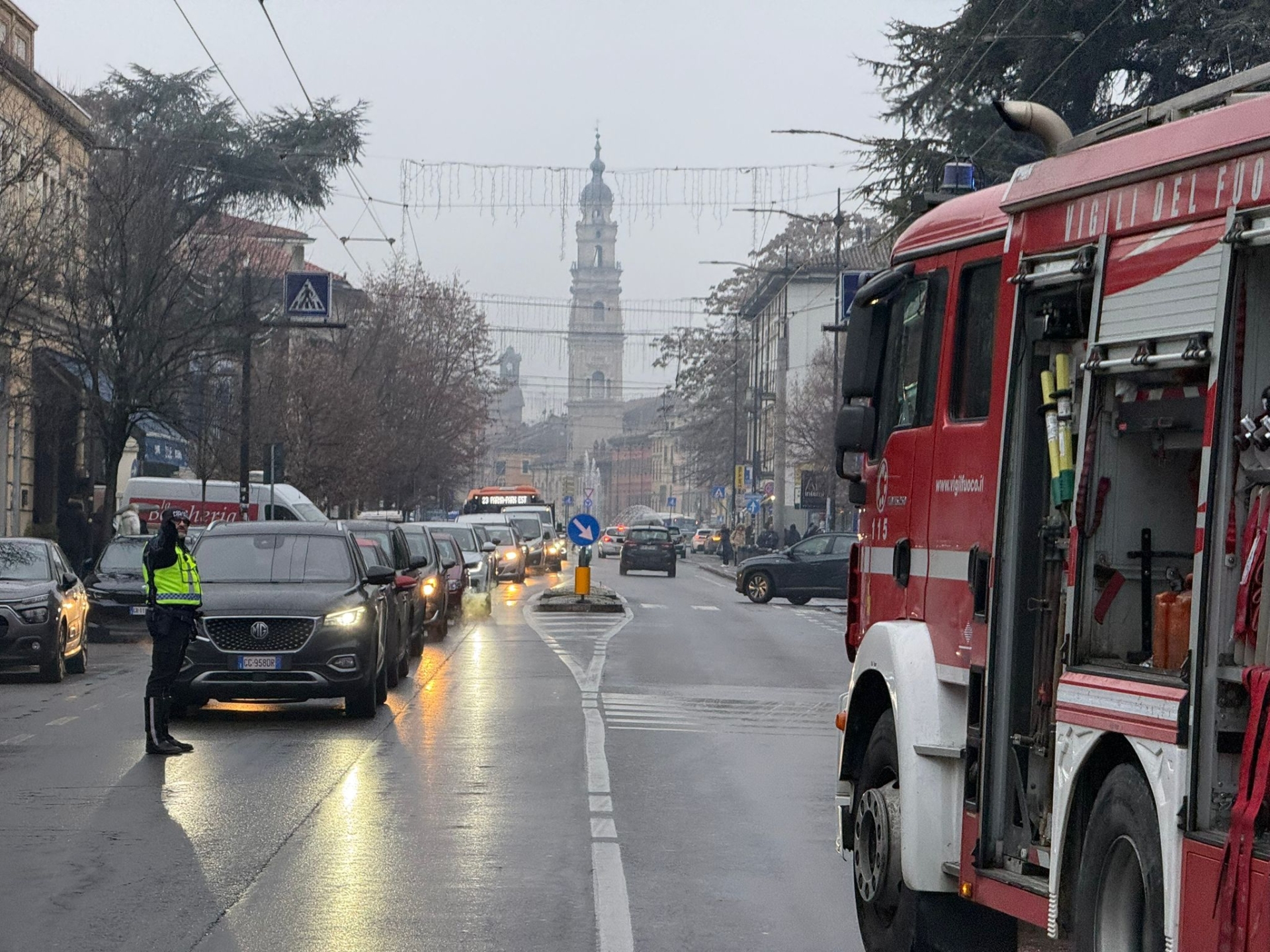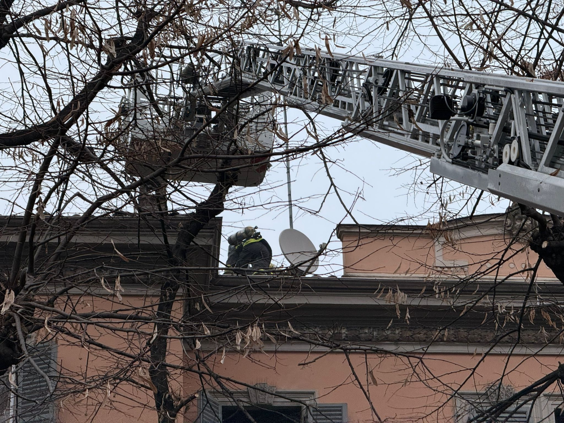 Tre mezzi dei vigili del fuoco in azione in via Emilia Est a causa dell’incendio che si è sviluppato in un appartamento che si trova nel tratto finale, dal Petitot al centro commerciale La Galleria.