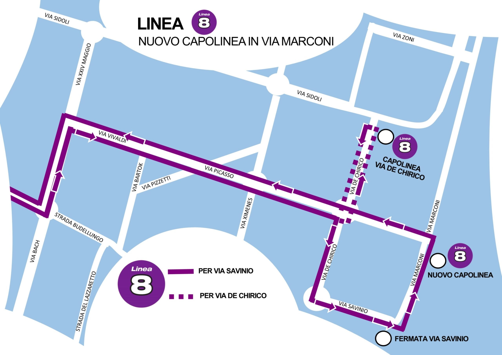 «Via Savinio» ha continuato ad essere riportata come destinazione di alcuni bus della linea 8 (l’altro capolinea nel quartiere San Lazzaro Est è in via de Chirico) e ancora in questi giorni la maggior parte degli autobus continua ad avere la scritta «Via Savinio», però la destinazione è il capolinea di via Marconi, attivo dallo scorso 31 luglio, come indicato nel sito Tep che riporta gli orari della linea 8. «Via Savinio» e «Via Marconi» indicano quindi lo stesso capolinea, ma la scritta «Via Savinio» è solo un ricordo del vecchio capolinea.