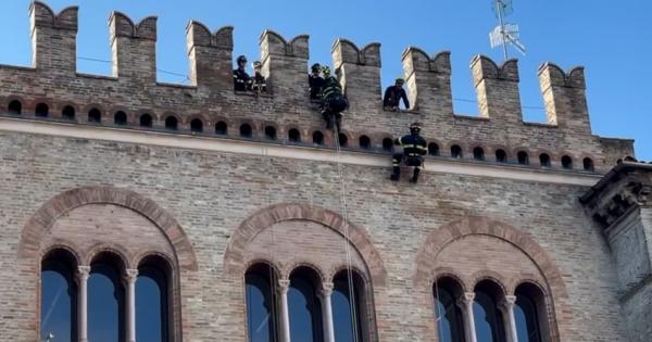 Tutti con il naso all'insù in piazza Garibaldi per la spettacolare esercitazione dei vigili del fuoco sul palazzo municipale. Ecco il video con una delle fasi dell'esercitazione.