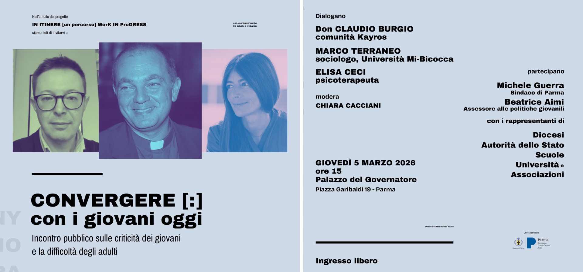 L'intenzione è di affrontare in maniera concreta e sinergica i temi delle criticità giovanili con la partecipazione dei giovani stessi, in un confronto aperto alla cittadinanza che raccolga tutti i principali attori istituzionali, insieme ai rappresentanti degli studenti. L'occasione è l'invito a “Convergere [:] con i giovani oggi”, incontro pubblico promosso dall'imprenditore Michele Pizzarotti nell'ambito del suo progetto “In Itinere - un percorso - work in progress”, dedicato ai ragazzi delle scuole e in corso nei principali istituti superiori della città. Giovedì 5 marzo alle 15, a Palazzo del Governatore l'ingresso sarà libero e aperto a tutti. Al tavolo dei relatori dialogheranno ospiti illustri come don Claudio Burgio, leader infaticabile della comunità Kayrós Onlus, la psicosociologa parmigiana Elisa Ceci e il docente del dipartimento di Sociologia e Ricerca Sociale dell'Università di Milano Bicocca, Marco Terraneo. Con la moderazione di Chiara Cacciani, parteciperanno al dibattito il sindaco Michele Guerra, l'assessore alle politiche giovanili Beatrice Aimi, il prorettore di UniPR Simone Baglioni, i vertici delle autorità di Stato, la Diocesi, le associazioni di terzo settore. Ma soprattutto i giovani, chiamati a convergere con gli adulti e gli adulti chiamati a farlo con loro, per loro. Si parlerà di disagio, violenza, abbandono scolastico, derive. Ma anche della difficoltà dei genitori, di proposte possibili, di esempi positivi e virtuosi.