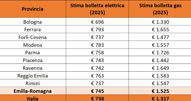 Guardando alle province dove le bollette della luce sono state più leggere, grazie a consumi più ridotti, al primo posto si trova Bologna, con una spesa media che si è fermata ad “appena” 696 euro (a fronte di consumi annui pari a 2.215 KWh), seguita, a pari merito, da Rimini e Forlì-Cesena (737 euro per 2.384 KWh annui). Le province emiliano-romagnole in cui, di contro, le bollette del gas sono state più leggere sono Bologna (al primo posto anche in questa classifica con 1.330 euro per 1.039 Smc), Piacenza (1.442 euro per 1.134 Smc) e Forlì-Cesena (1.477 euro) per 1.164 Smc