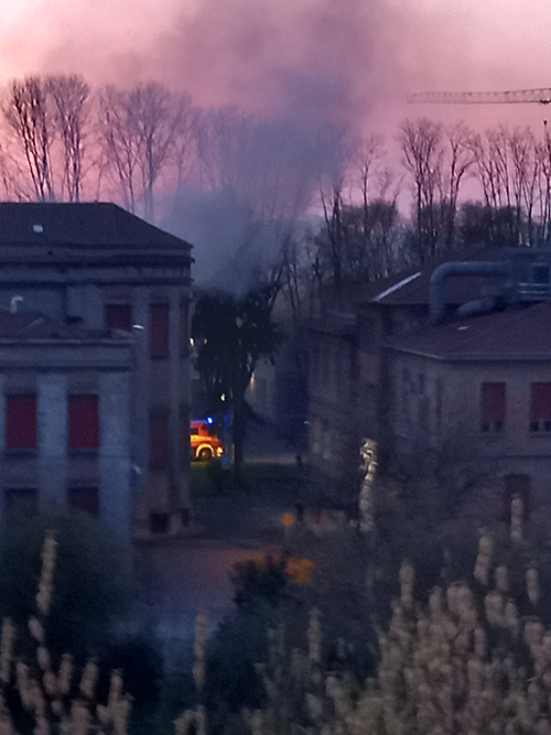 Fiamme e fumo in un padiglione abbandonato dell'ospedale Maggiore nel tardo pomeriggio. L'incendio è stato visto da numerose persone. Alcuni "Gazzareporter" ci hanno inviato le loro testimonianze: pubblichiamo il video di Giona e, qui sotto, la foto della lettrice Donata.