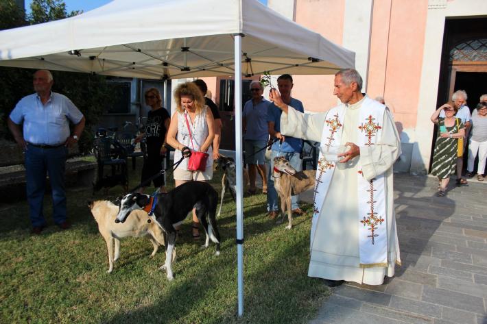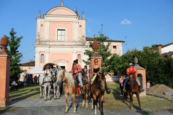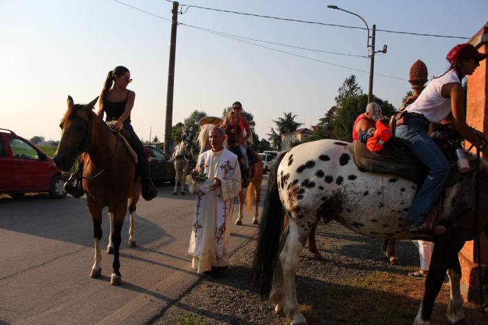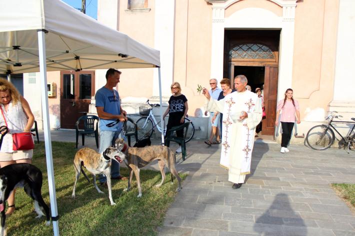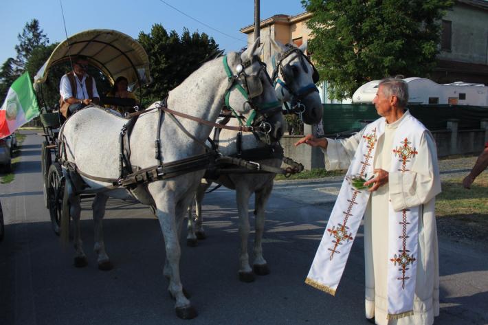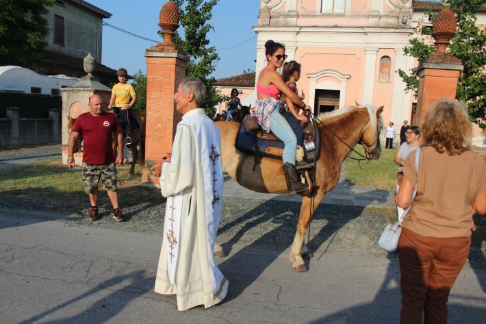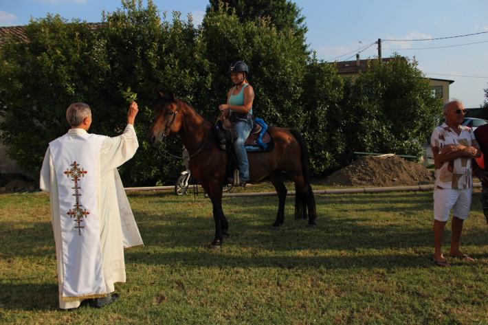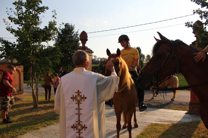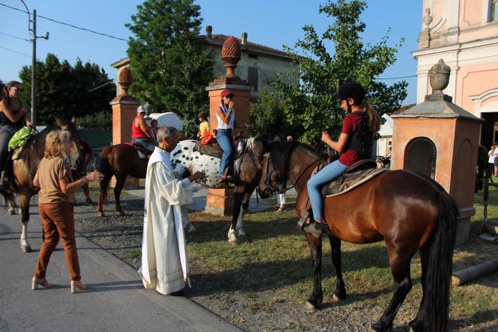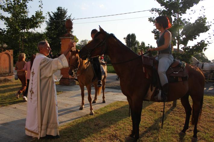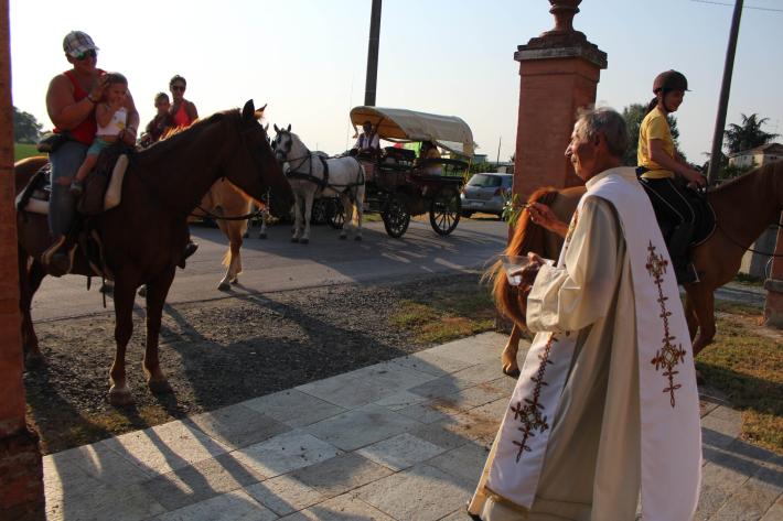 Rinnovando una significativa tradizione che affonda le sue radici ai fatti prodigiosi di quasi tre secoli fa, il settecentesco santuario di san Rocco in Ardola di Polesine Zibello, sabato sera si è trasformato in una suggestiva “Arca di Noè”. E’ infatti tornata la messa (presieduta dal parroco don Gianni Regolani) seguita dalla benedizione degli animali, che con i loro padroni si sono radunati, ancora una volta, sia in chiesa che nel santuario. Alla fine della celebrazione, don Gianni ha benedetto cani, gatti e, soprattutto, i tanti cavalli presenti. E’ stata anche l’occasione per rievocare la storia del luogo con i suoi misteri. Il settecentesco Santuario di San Rocco in Ardola di Polesine Zibello svetta nella campagna parmense con la sua facciata slanciata e con la storia, decisamente affascinante, e ricca di misteri, che lo riguarda. Il sacro edificio, al centro negli ultimi anni di importanti lavori che lo hanno riportato al suo originario splendore (realizzati grazie alla generosità di enti, associazioni e privati cittadini e con l’impegno di instancabili volontari locali), rimane a testimoniare gli eventi prodigiosi accaduti nell’anno 1746, in occasione di una terribile epidemia di peste. Il 15 luglio di quell’anno, mentre numerosi fedeli si trovavano davanti al vecchio oratorio di San Rocco (che sorgeva laddove oggi si trova il Santuario) per implorare il Santo ed impetrare benedizioni celesti affinché avesse finalmente termine la calamità, improvvisamente, davanti allo sguardo stupito dei presenti, in un piccolo fosso che correva, come corre ancora oggi, poco distante, in fregio alla strada comunale, scaturirono due sorgenti d’acqua, sul principio di colore “rossetto” per assumere poi una colorazione più naturale, come si legge nel prezioso diario lasciato dal parroco don Bartolomeo Zerbini. L’evento in sé venne ritenuto subito come innaturale e straordinario, attesa l’aridità del suolo, la stagione estiva e la persistente siccità che si stava manifestando lì come altrove. La popolazione, conscia del fatto che si stava verificando un fenomeno soprannaturale, iniziò ad abbeverare gli animali colpiti da pestilenza, i quali immediatamente guarivano in maniera prodigiosa. Diffusasi ben presto la voce del fatto miracolosa, i fedeli d’ogni parte accorrevano numerosi per pregare, elargire elemosine e celebrare feste in onore del Santo protettore. Giungevano pellegrini anche dalla vicina Lombardia, e dalla provincia di Cremona in particolare, dimostrandosi particolarmente devoti alla popolarissima figura di San Rocco che si venerava in Ardola. In appena pochi giorni venne raccolto tanto denaro da consentire l’edificazione di un nuovo e più ampio oratorio del quale, il giorno 24 settembre di quello stesso anno, si posero le prime pietre della fondamenta. Nel settembre di tre anni più tardi, il sacro edificio era già terminato ed il giorno otto del susseguente mese di ottobre veniva solennemente benedetto da Monsignor Missini, vescovo di Borgo San Donnino (l’odierna Fidenza). Ancora nelle sue memorie don Zerbini scrive: L’Oratorio è quello che ora si ammira per la sua elegante costruzione d’ordine Corinto, lavoro senza dubbio di abilissimo architetto di cui non si conosce il nome.