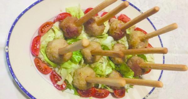 Partiamo lessando la patata, la schiacciamo con i rebbi della forchetta e la incorporiamo al macinato insieme all’uovo, al parmigiano e al prezzemolo; aggiustiamo di sale e pepe e formiamo tante palline rotonde che passeremo nel pane grattugiato. Posizioniamo le polpette in una teglia, irroriamo con poco olio e cuociamo al forno a 170° per 20 minuti circa. Su un piatto da portata prepariamo un letto di insalata condita dove affosseremo le nostre polpette infilzate con un grissino. I bimbi si divertiranno molto con questa presentazione e sicuramente faranno il bis.