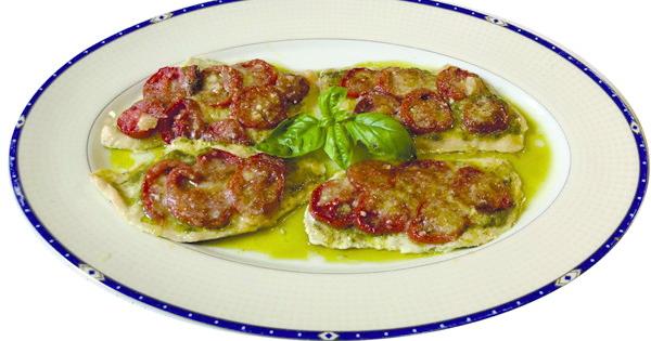In una teglia da forno posizioniamo le fetta di pollo leggeremente infarinate, saliamo, le copriamo di pesto alla genovese, quindi le fettine di pomodoro tagliate sottili, e, per ultimo, abbondante il parmigiano grattuggiato. Non c'è bisogno di aggiungere olio perché il pesto ne sprigionerà parecchioe andrà a irrorare le fettine di carne. In forno a 180 gradi per un quarto d'ora e il piatto è pronto. Delizioso.