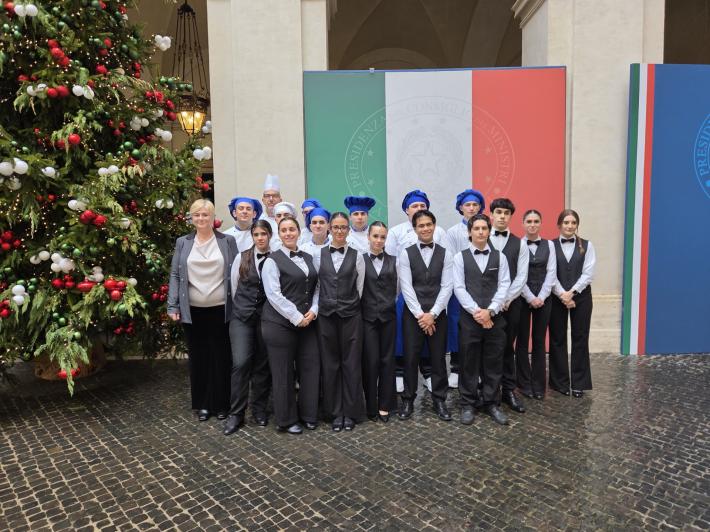 Un altro significativo tassello di prestigio e orgoglio per i prodotti del nostro territorio. E tanta tanta soddisfazione per un gruppo di ragazzi di casa nostra. Si è rinnovato anche quest'anno il tradizionale scambio di auguri per le festività natalizie tra il presidente del consiglio, Giorgia Meloni, e il personale della presidenza del consiglio dei ministri. A impreziosire l'evento la mise en place, nel Cortile d'Onore di Palazzo Chigi, di cinque istituti scolastici, in testa l’Istituto “Magnaghi-Solari” di Salso. Poi l'Istituto “Vergani-Navarra” di Ferrara, l’Istituto “Francesco Morano” di Caivano, l’Istituto “Domenico Modugno" di Polignano, l'Accademia di Alta Formazione di Sala "Intrecci" di Castiglione in Teverina. Ill tema di quest’anno non poteva che essere il riconoscimento della cucina italiana come Patrimonio immateriale dell’Unesco. Al centro del buffet, quindi, i più importanti prodotti italiani tra cui il parmigiano reggiano e prodotti tipici della tradizione culinaria emiliana (dal culatello alla coppa) e campana (dal panuozzo bruscato ai taralli, fino alla mozzarella di bufala). Tra gli ospiti d’onore della presidente del consiglio Giorgia Meloni e del ministro dell’agricoltura Lollobrigida, il presidente del consorzio del Parmigiano Reggiano Nicola Bertinelli, spesso coinvolto dal ministro stesso in varie iniziative che hanno contribuito ad aumentare il prestigio e il valore, in primis del nostro prodotto ma anche di tutto il patrimonio agroalimentare virtuoso italiano. Il lavoro svolto dal Consorzio negli ultimi periodi, come annunciato nella recente assemblea generale di fine anno, ha consolidato il proprio valore aprendo porte luminose sul futuro e, soprattutto, evidenziando un paradigma di gestione, programmazione e progetto, che innegabilmente può rappresentare un traino anche per tutte le altre realtà dell’agroalimentare nazionale. Il Consorzio chiude il 2025 con 66 milioni di ricavi di cui 44 saranno destinati alla divulgazione nel mondo dei valori e del saper fare di una delle tradizioni millenarie italiane: “l’impegno condiviso di tutti gli operatori sarà determinante per garantire equilibrio, sostenibilità e valore al nostro prodotto e per accompagnarlo in un percorso di ulteriore crescita e prestigio a livello globale” dice Nicola Bertinelli