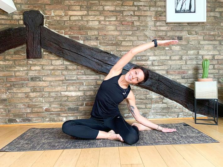 Da seduti, piede destro contro la coscia sinistra. Inspirando, allungarsi verso l’alto, espirando flettere busto e braccia verso il lato sinistro. Rimanere in posizione per tre respiri profondi e ripetere dal lato opposto.