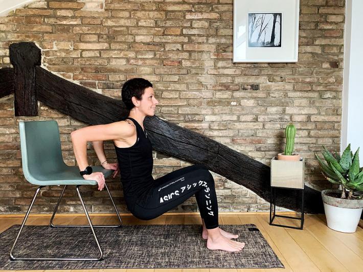 Seduti, palmi sul bordo della sedia. Staccare il bacino, inspirando scendere verso terra, gomiti piegati fino a formare un angolo di 90°. Facendo forza con le braccia ed espirando, estendere completamente. 3 serie x 8 ripetizioni.