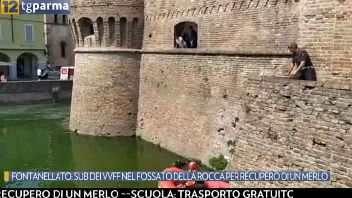 Era stato travolto nella caduto di un albero "storico", un bagolaro, e anche uno dei merli della Rocca di Fontanellato era finito nel fossato. Per recuperarlo, questa mattina sono intervenuti i vigili del fuoco col reparto sommozzatori.