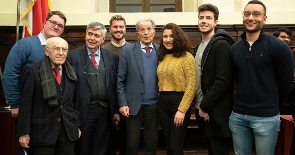 Foto: Prodi in posa con i giovani del Collegio Europeo e gli studenti del prof. Fausto Pagnotta