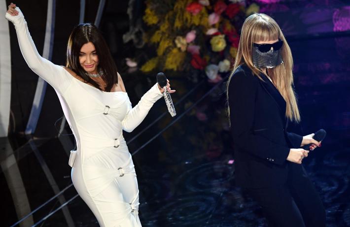 Accennano un bacio saffico Elettra Lamborghini e Myss Keta, che duettano sul palco dell’Ariston - in una performance non memorabile e sopra le righe - su Non succedera più.