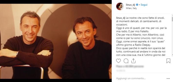Albertino lascia Radio Deejay dopo 35 anni e anche suo fratello Linus pubblica un saluto sui social network. E come sul profilo di Albertino, anche qui fioccano i messaggi del pubblico e i "like".