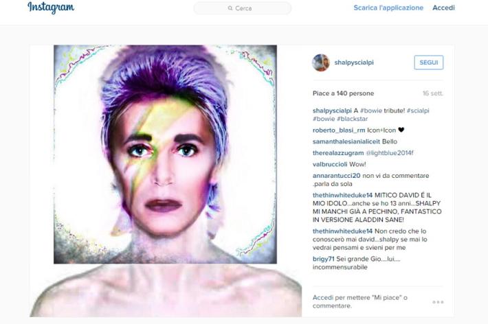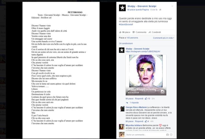 Questo il testo del post, riferito al testo di "Pettirosso", canzone del cantautore parmigiano dedicata all'amore gay (in uscita il 19 gennaio) ma, nell'occasione, dedicata (con tanto di foto, truccato come Bowie), al Duca Bianco.