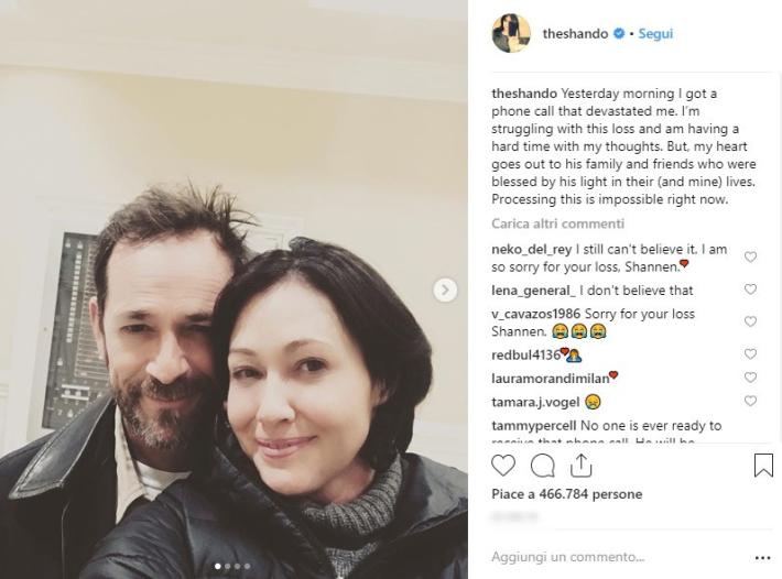 SHANNEN DOHERTY (BRENDA): "SONO DEVASTATA. IL MIO CUORE VA ALLA SUA FAMIGLIA E AGLI AMICI". "Ieri mattina ho ricevuto una telefonata che mi ha devastata - scrive su Instagram l'attrice che interpretava Brenda in Beverly Hills 90210 -. Sto combattendo con questa perdita e sto attraversando un periodo difficile con i miei pensieri. Ma il mio cuore va alla sua famiglia e agli amici che sono benedetti dalla sua luce nelle loro vite (e nella mia). Elaborare tutto questo mi è impossibile, al momento".