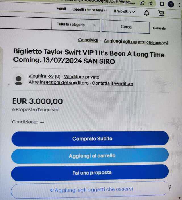 Ma secondo l’associazione a difesa dei consumatori sono anche privati cittadini a mettere in vendita ticket a tariffe stellari: ad esempio sulla piattaforma eBay si trovano oggi biglietti per le date del 13 o 14 luglio a cifre che raggiungono i 3.000 euro.