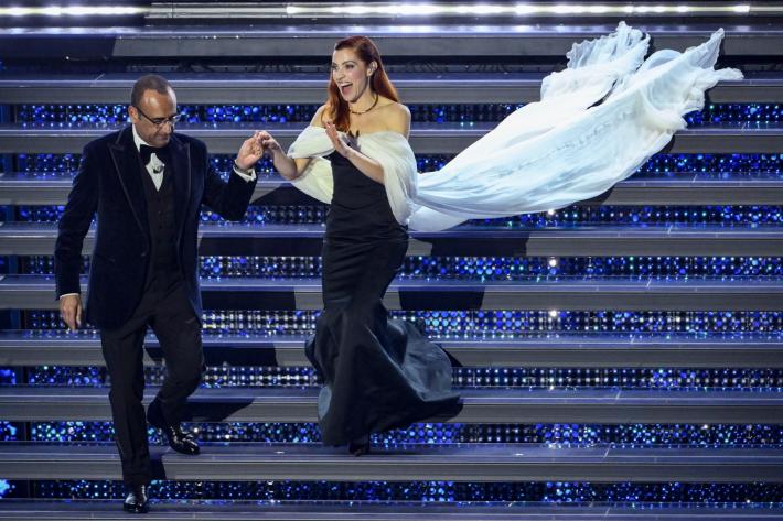 Carlo Conti e Gerry Scotti indossano occhiali scuri, «da saldatore», per presentare Antonella Clerici, «una sorella nel vero senso della parola», dice il direttore artistico, che come promesso sfoggia un abito lungo scintillante in nero e argento, che attraverso le trasparenze lascia intravedere le gambe.