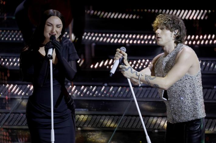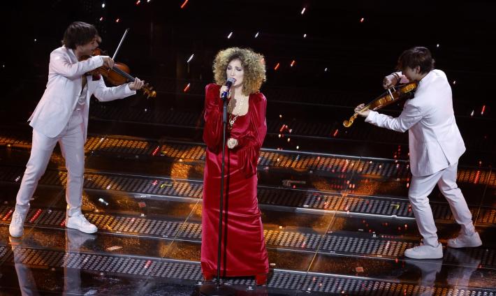 Eleganze e stravaganze nella quarta serata del festival di Sanremo dall’abito di piume di Rose Villain al pantalone rosso baiadera di Mahmood.