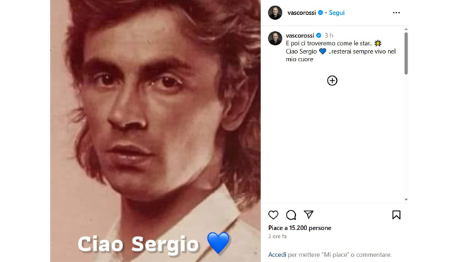 Vasco ha affidato il suo ricordo ai social postando una foto di Silvestri da ragazzo sulla quale ha scritto «Ciao Sergio» con un cuore blu. Rossi ha accompagnato l’immagine con notissima strofa della sua "Vita Spericolata": «E poi ci troveremo come le star". Ciao Sergio, resterai sempre vivo nel mio cuore».