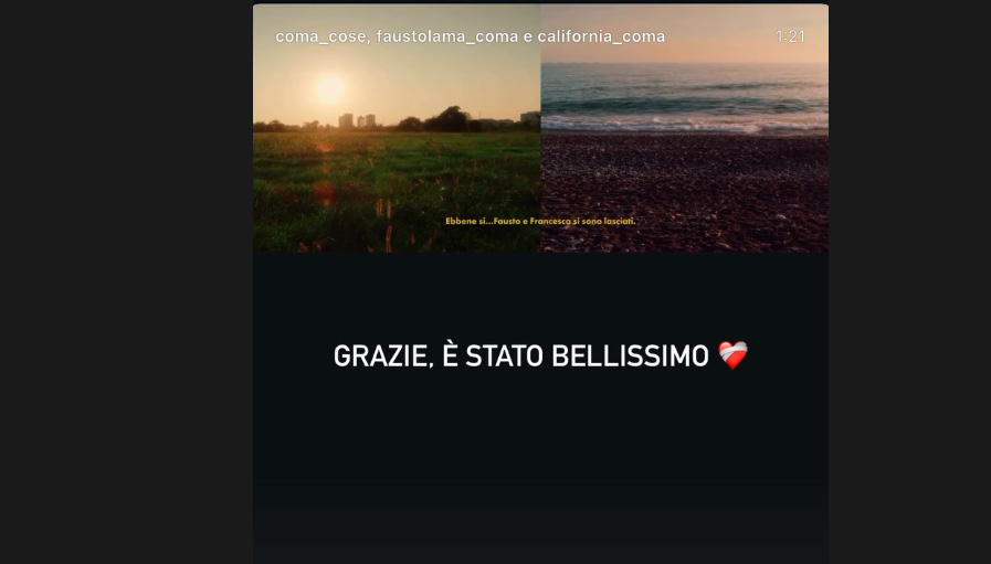 Fausto e Francesca si sono lasciati. I Coma Cose non sono più una coppia nella vita. Da tempo c'erano "rumors" sul rapporto fra i componenti del famoso duo. Ora arriva l'annuncio ufficiale con un messaggio sui social: "Abbiamo capito che ormai eravamo solo una coppia sul palco e non c’era proprio più nulla da riprendere", scrivono tra l'altro. "È stata una decisione unanime maturata negli ultimi mesi in cui abbiamo preferito mantenere la questione privata per metabolizzarla e rispettare tutti i vari impegni. La verità è che non ci siamo mai fermati in questi anni e abbiamo dato troppe cose per scontate, la grande sinergia lavorativa pian piano ha cannibalizzato la vita privata che si è inevitabilmente consumata e spenta", dicono i due cantanti nel messaggio congiunto.