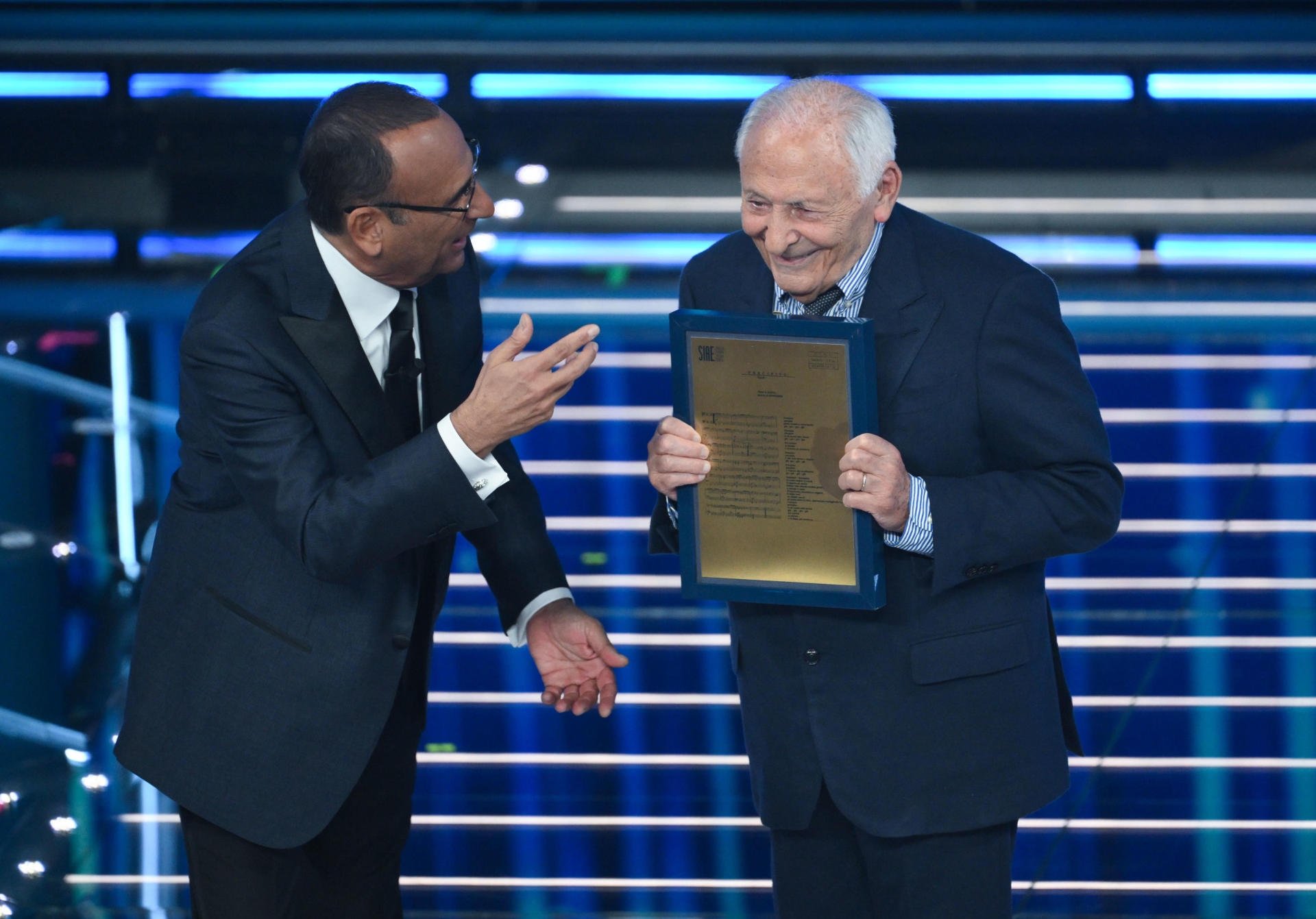 «Ecco la storia della musica italiana», dice Carlo Conti introducendo sul palco dell’Ariston, Giulio Rapetti Mogol, festeggiato con il premio alla carriera a pochi mesi dai 90 anni che compie il prossimo 17 agosto. Tutto l’Ariston è in piedi per lui. «Un’accoglienza così mi ha commosso», dice Mogol ricordando di aver «depositato 1776 canzoni alla Siae e venduto 523 milioni di dischi nel mondo, anche se non ci crede nessuno».