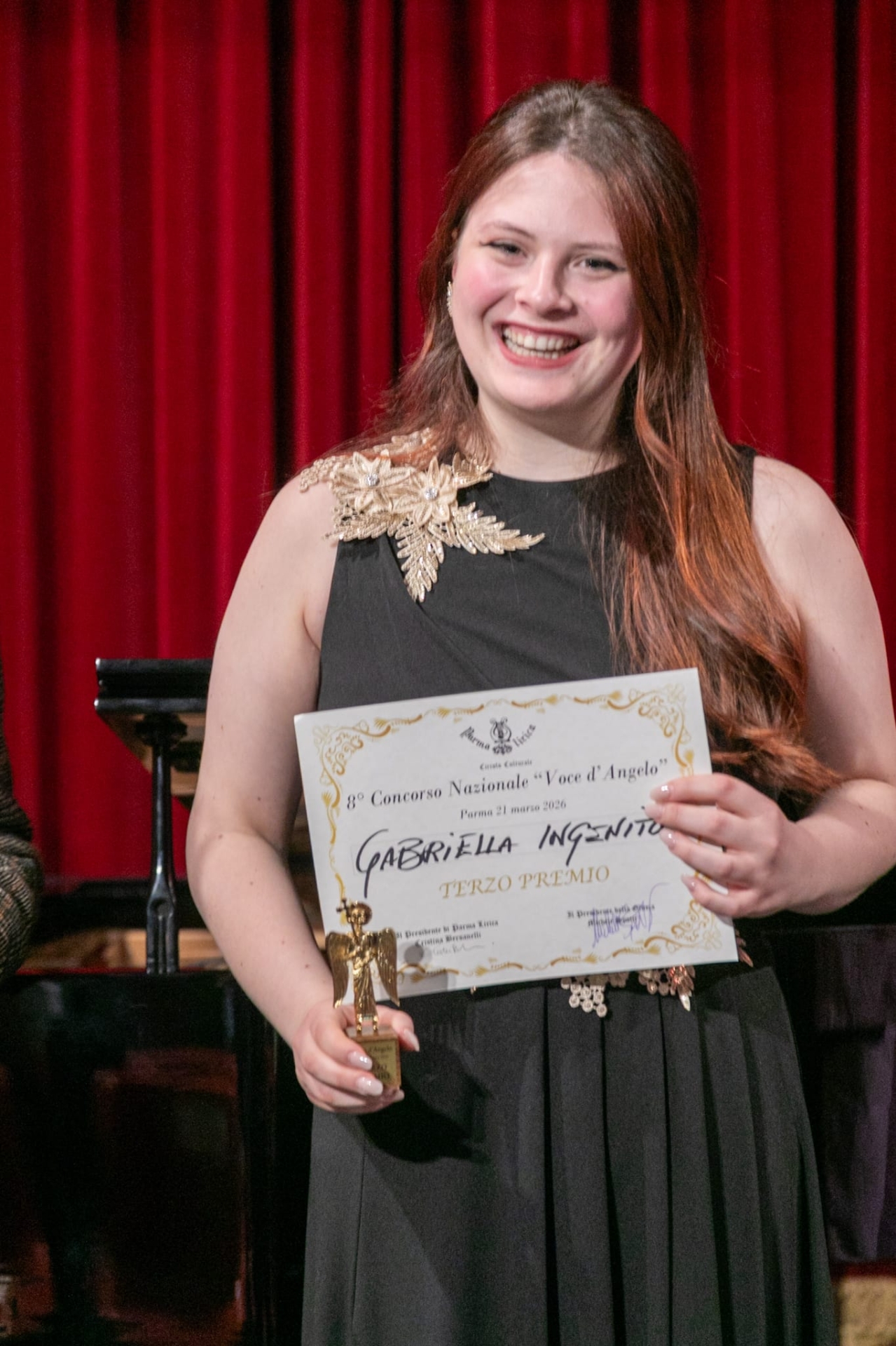 Il terzo premio è andato al soprano ventiquattrenne Gabriella Ingenito, laureata con lode al Conservatorio Paganini di Genova: ha esordito con la frizzante «Je veux vivre» da «Roméo et Juliette» di Gounod e ha incantato il pubblico con il valzer di Musetta dalla «Bohème» di Puccini, conquistando anche il Premio speciale Parma Lirica assegnato dal pubblico in sala.