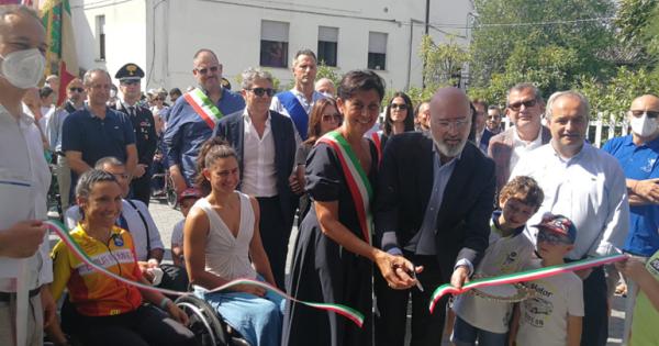 Al varo della struttura, con la sindaca di Neviano degli Arduini il presidente della Regione Emilia-Romagna, insieme alla campionessa del mondo di nuoto paralimpico, Giulia Ghiretti, il direttore generale del progetto Ryder cup, Giampaolo Montali, numerosi altri sindaci e amministratori e atleti professionisti.