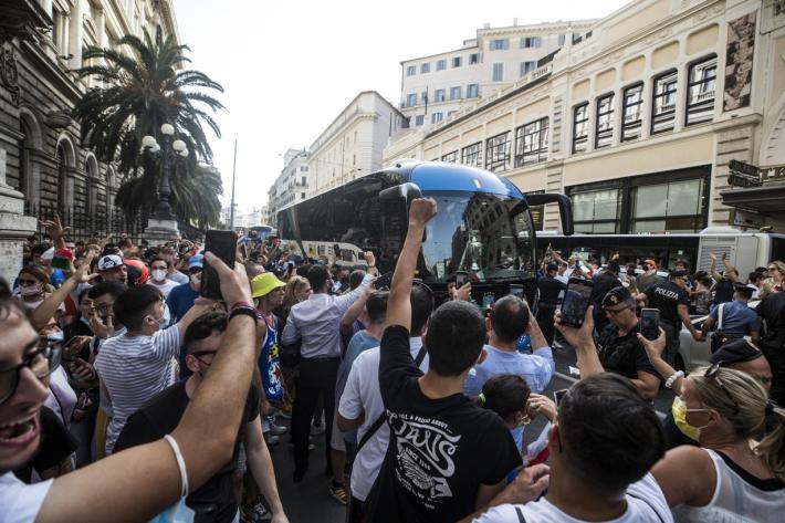 Bagno di folla per gli azzurri del calcio campioni d’Europa. I giocatori della Nazionale di Roberto Mancini, usciti da Palazzo Chigi, sono saliti a bordo del bus scoperto che attraverserà Roma, non prima di essersi goduti il calore dei tifosi concedendosi con alcuni per i selfie. Dal livello superiore del bus gli azzurri hanno issato al cielo il trofeo, scatenando l’ovazione delle centinaia di persone raccolte attorno a piazza Colonna. Poi assieme alla gente hanno cantato l’inno nazionale. Secondo quanto previsto, il bus percorrerà via del Corso, piazza Venezia, e risalirà via del Tritone verso via Veneto fino all’albergo del ritiro